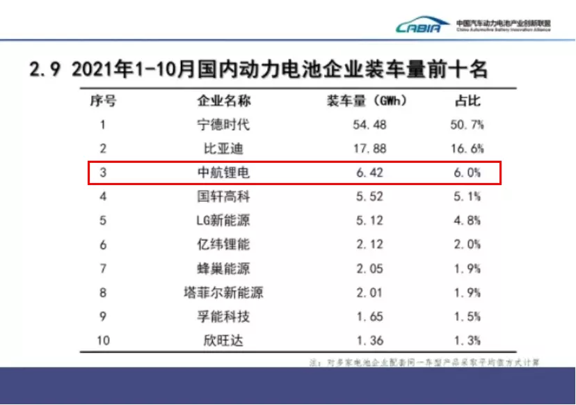 在10月底韓國市場研究機構(gòu)SNE Research公布的2021年1-9月全球動力電池裝車量排行榜中,中航鋰電以5.6GWh的動力電池裝車量,位居第七。