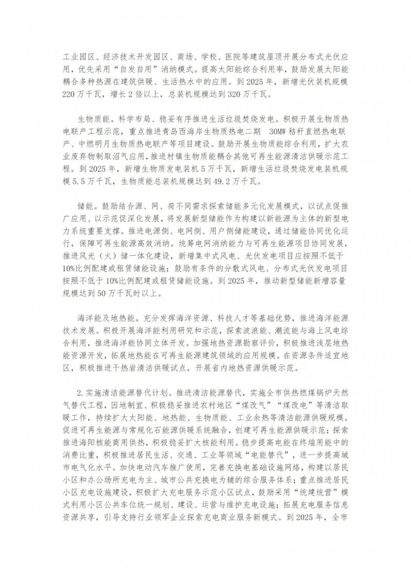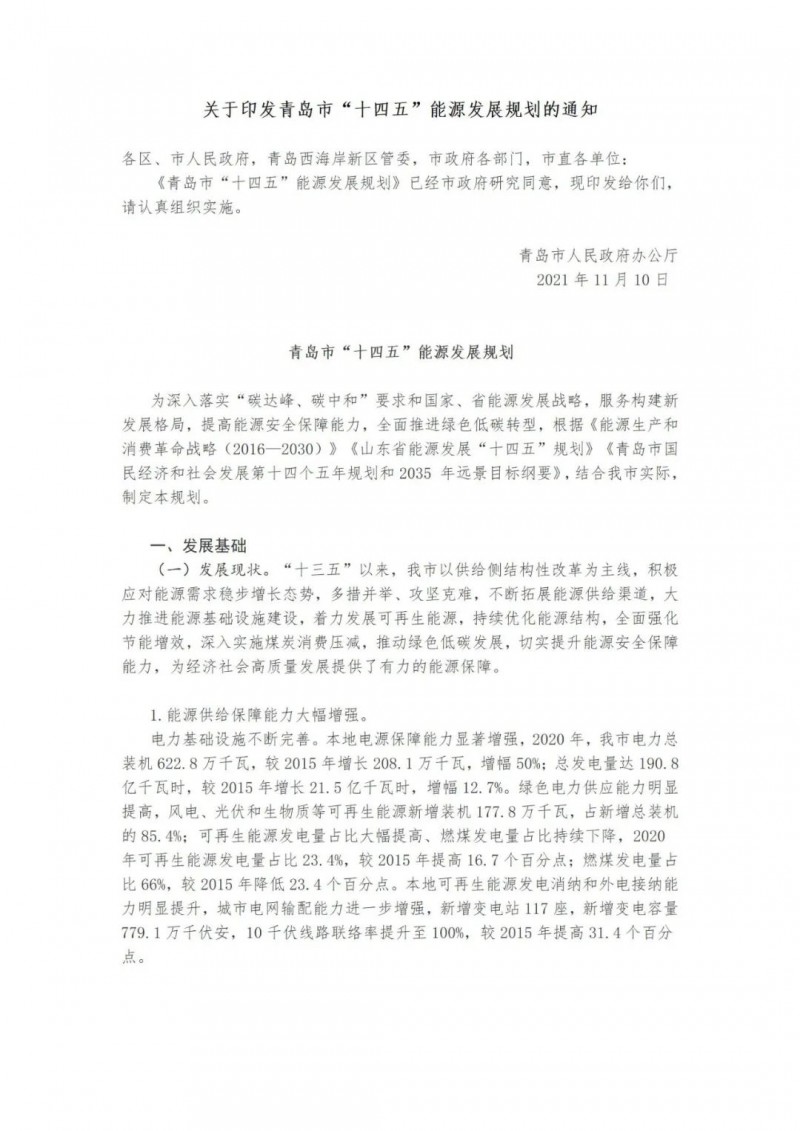 近日,山東青島市人民政府辦公廳印發(fā)了《關(guān)于印發(fā)青島市“十四五”能源發(fā)展規(guī)劃的通知》。提出了青島市“十四五”能源發(fā)展的主要任務(wù)和建設(shè)重點(diǎn)。實(shí)施可再生能源倍增計(jì)劃。以風(fēng)電、光伏發(fā)電為重點(diǎn),以生物質(zhì)能、海洋能、地?zé)崮艿葹檠a(bǔ)充。到2025年,可再生能源裝機(jī)容量新增270萬千瓦左右,總裝機(jī)容量達(dá)到523萬千瓦左右,占電力總裝機(jī)的比重提升至48%左右。