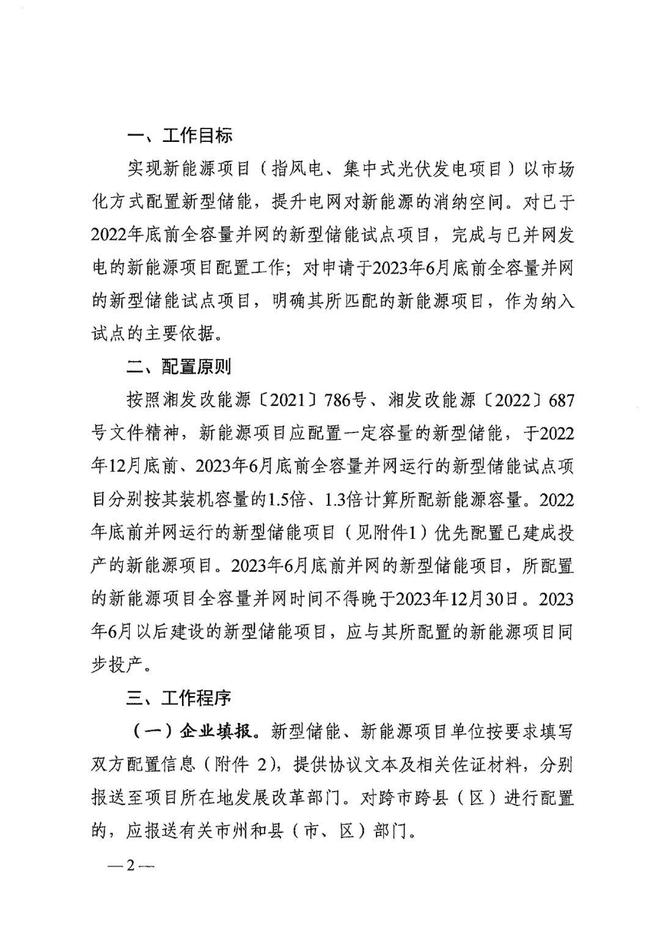 按照湖南發(fā)改委相關(guān)文件,新能源項(xiàng)目應(yīng)配置一定容量的新型儲(chǔ)能,于2022年12月底前,2023年6月底前全容量并網(wǎng)運(yùn)行的新型儲(chǔ)能試點(diǎn)項(xiàng)目分別按其裝機(jī)容量的1.5倍、1.3倍計(jì)算所配新能源容量。