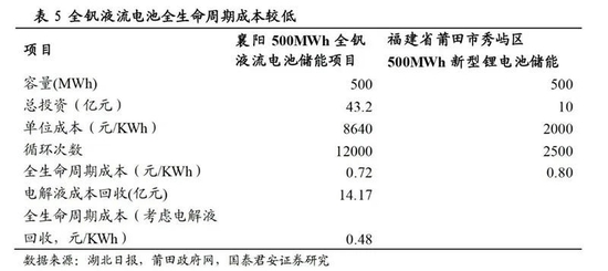 不過,釩電池儲(chǔ)能也有其劣勢(shì),除了當(dāng)下技術(shù)還不夠成熟之外,其初始投入也高于鋰電池等技術(shù)。國(guó)泰君安測(cè)算了襄陽500MWh全釩液流電池儲(chǔ)能項(xiàng)目與莆田500MWh新型鋰電池儲(chǔ)能項(xiàng)目的投資回收情況,在容量規(guī)模相同的情況下,前者的總投資為43.2億元,而后者為10億元。
