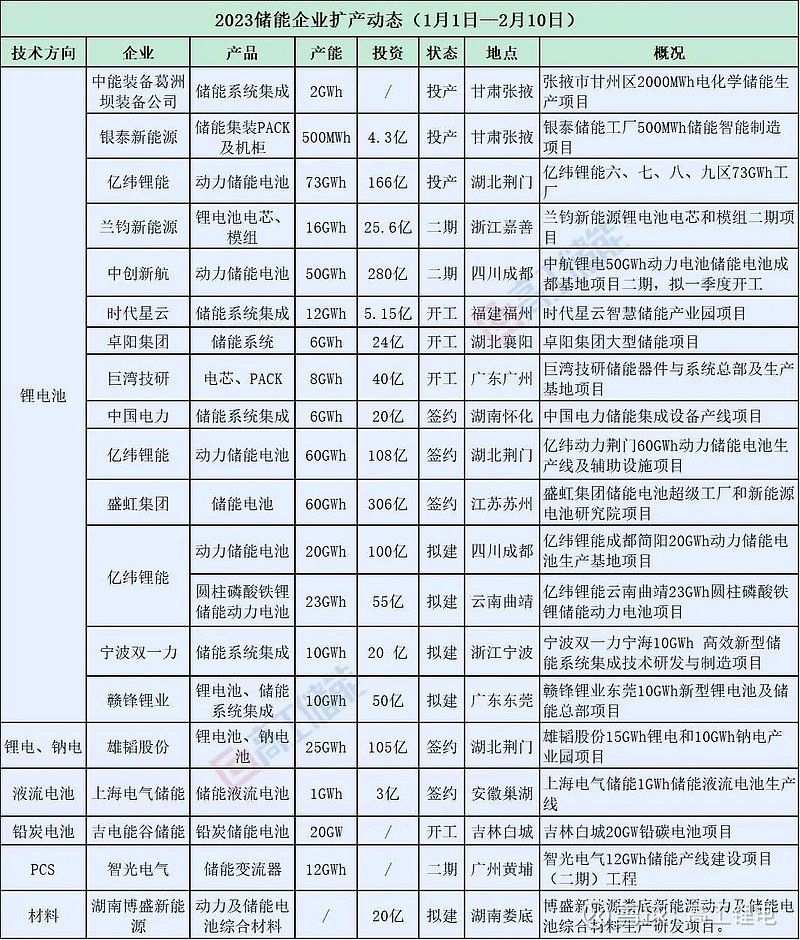 2023開年以來(lái),儲(chǔ)能行業(yè)迎來(lái)新一輪擴(kuò)產(chǎn)高峰,擴(kuò)產(chǎn)企業(yè)中,電池企業(yè)和儲(chǔ)能系統(tǒng)集成企業(yè)占比最多。