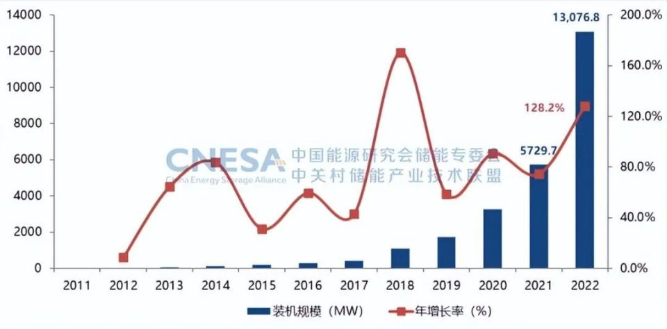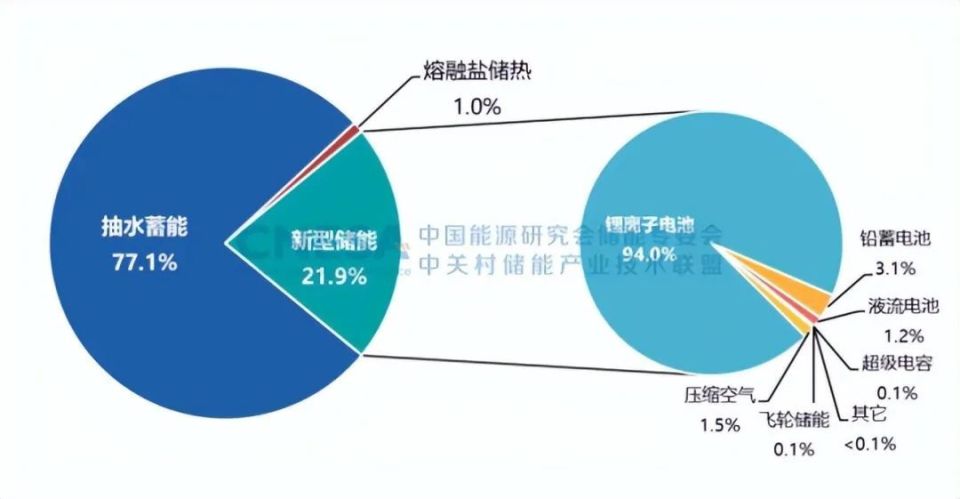 2022年,中國新增投運(yùn)電力儲能項(xiàng)目裝機(jī)規(guī)模首次突破15GW,達(dá)到16.5GW,其中,抽水蓄能新增規(guī)模9.1GW,同比增長75%;新型儲能新增規(guī)模創(chuàng)歷史新高,達(dá)到7.3GW/15.9GWh,功率規(guī)模同比增長200%,能量規(guī)模同比增長280%;新型儲能中,鋰離子電池占據(jù)絕對主導(dǎo)地位,比重達(dá)97%,此外,壓縮空氣儲能、液流電池、鈉離子電池、飛輪等其它技術(shù)路線的項(xiàng)目,在規(guī)模上有所突破,應(yīng)用模式逐漸增多。