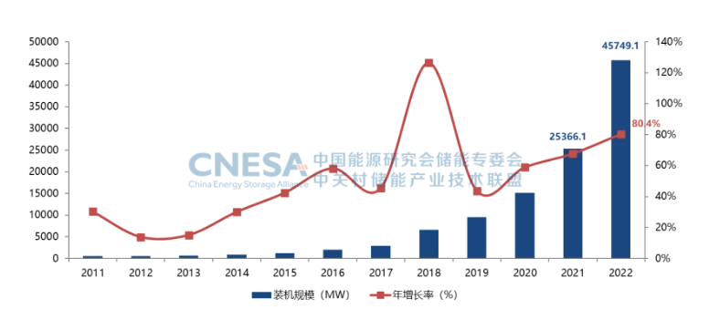 根據(jù)CNESA全球儲能項(xiàng)目庫的不完全統(tǒng)計(jì),截至2022年底,中國已投運(yùn)電力儲能項(xiàng)目累計(jì)裝機(jī)規(guī)模59.8GW,占全球市場總規(guī)模的25%,年增長率38%。抽水蓄能累計(jì)裝機(jī)占比同樣首次低于80%,與2021年同期相比下降8.3個百分點(diǎn);新型儲能繼續(xù)高速發(fā)展,累計(jì)裝機(jī)規(guī)模首次突破10GW,達(dá)到13.1GW/27.1GWh,功率規(guī)模年增長率達(dá)128%,能量規(guī)模年增長率達(dá)141%。