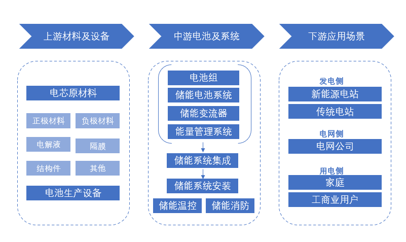 從整個產(chǎn)業(yè)鏈角度看,儲能產(chǎn)業(yè)鏈上游主要為材料及設(shè)備供應(yīng),中游主要為儲能系統(tǒng)的集成與制造,下游主要為電力系統(tǒng)儲能、備用電源及其他領(lǐng)域等。