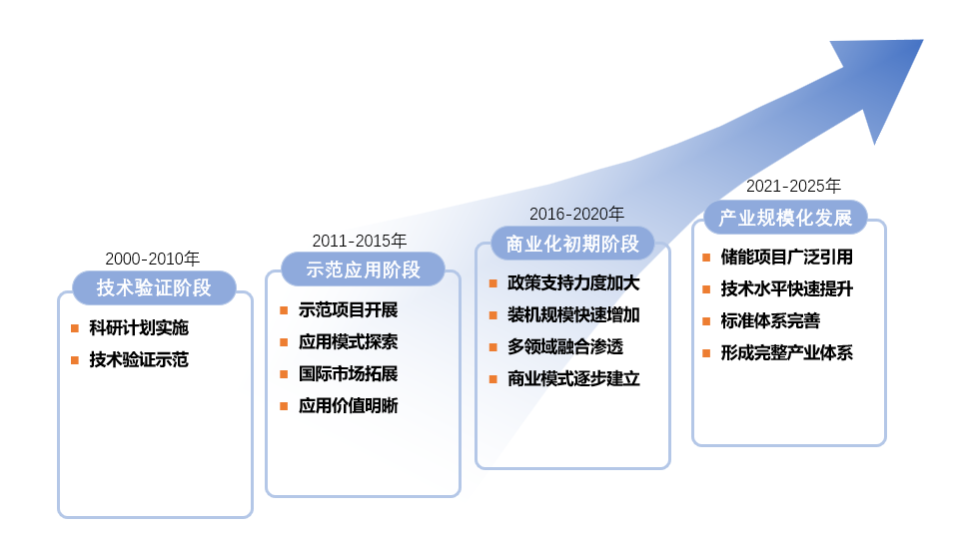 我國儲能市場大致可分為四個發(fā)展階段:一是技術(shù)驗(yàn)證階段(2010年以前),主要是開展基礎(chǔ)研發(fā)和技術(shù)驗(yàn)證示范;二是示范應(yīng)用階段(2011~2015年),通過示范項(xiàng)目開展,儲能技術(shù)性能快速提升、應(yīng)用模式不斷清晰,應(yīng)用價值被廣泛認(rèn)可,這個時期的儲能裝機(jī)以傳統(tǒng)的抽水蓄能為主;三是商業(yè)化初期(2016~2020年),隨著政策支持力度加大、市場機(jī)制逐漸理順、多領(lǐng)域融合滲透,儲能裝機(jī)規(guī)模快速增加、商業(yè)模式逐漸建立;四是產(chǎn)業(yè)規(guī)模化發(fā)展階段(2021~2025年),儲能產(chǎn)業(yè)進(jìn)入從產(chǎn)業(yè)化初期向規(guī)?;l(fā)展的過渡階段,隨著國家“雙碳”政策提出,儲能規(guī)模獲得了快速增長,儲能項(xiàng)目廣泛應(yīng)用、技術(shù)水平快速提升、標(biāo)準(zhǔn)體系日趨完善,形成較為完整的產(chǎn)業(yè)體系和一批有國際競爭力的市場主體,儲能成為能源領(lǐng)域經(jīng)濟(jì)新增長點(diǎn)。2022年2月,國家發(fā)展改革委、國家能源局印發(fā)的《“十四五”新型儲能發(fā)展實(shí)施方案》(以下簡稱“《實(shí)施方案》”)提出,到2025年,新型儲能由商業(yè)化初期步入規(guī)?;l(fā)展階段,具備大規(guī)模商業(yè)化應(yīng)用條件,有望2030年前后實(shí)現(xiàn)全面市場化。其中,新型儲能是指除抽水蓄能以外的新型儲能技術(shù),包括新型鋰離子電池、液流電池、飛輪、壓縮空氣、氫(氨)儲能、熱(冷)儲能等。