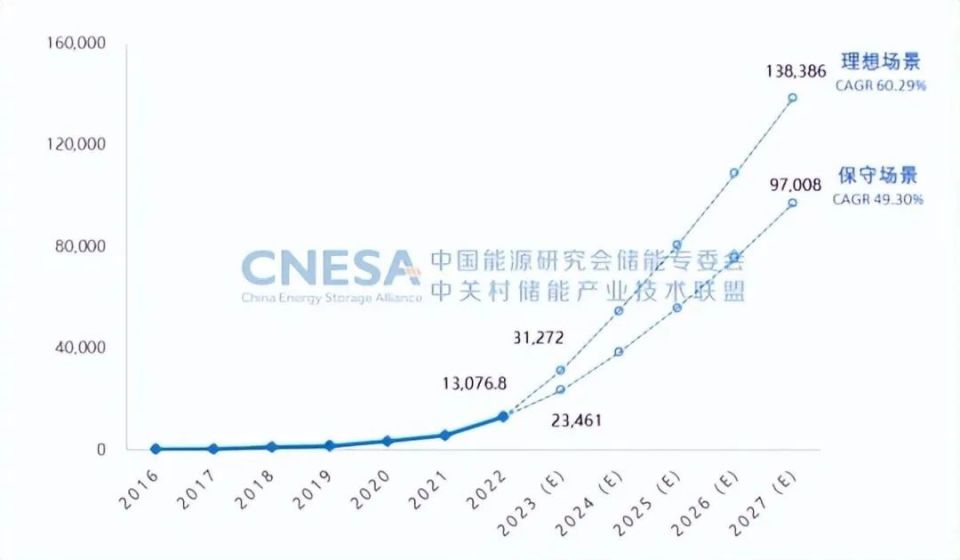 經(jīng)歷“十三五”孕育,“十四五”時期,我國新型儲能市場有望邁上新臺階。2021開始,我國新型儲能從商業(yè)化初期向規(guī)?;l(fā)展,根據(jù)CNESA預(yù)測,在未來5年,“新能源+儲能”是新型儲能的主要應(yīng)用場景,政策推動將構(gòu)成中國儲能市場的主要增長動力;根據(jù)中國能源研究會儲能專委會/中關(guān)村儲能產(chǎn)業(yè)技術(shù)聯(lián)盟(CNESA)全球儲能數(shù)據(jù)庫的不完全統(tǒng)計(jì),截至2022年底,國內(nèi)已投運(yùn)的電力儲能項(xiàng)目累計(jì)裝機(jī)達(dá)59.8GW,占全球市場總規(guī)模的25%,年增長率38%,其中新型儲能持續(xù)高速發(fā)展,累計(jì)裝機(jī)規(guī)模首次突破10GW,累計(jì)裝機(jī)規(guī)模首次突破10GW,達(dá)到13.1GW/27.1GWh。未來5年,“新能源+儲能”是新型儲能的主要應(yīng)用場景,政策推動是主要增長動力;根據(jù)中關(guān)村儲能產(chǎn)業(yè)技術(shù)聯(lián)盟(CNESA)對我國新型儲能未來5年市場規(guī)模的預(yù)測,保守場景下,預(yù)計(jì)2027年新型儲能累計(jì)規(guī)模將達(dá)到97.0GW,2023-2027年復(fù)合年均增長率(CAGR)為49.3%;理想場景下,預(yù)計(jì)2027年新型儲能累計(jì)規(guī)模將達(dá)到138.4GW,2023-2027年復(fù)合年均增長率(CAGR)為60.3%。預(yù)計(jì)未來5年,年度新增儲能裝機(jī)呈平穩(wěn)上升趨勢。保守場景下,年平均新增儲能裝機(jī)為16.8GW;理想場景下,年平均新增儲能裝機(jī)為25.1GW。