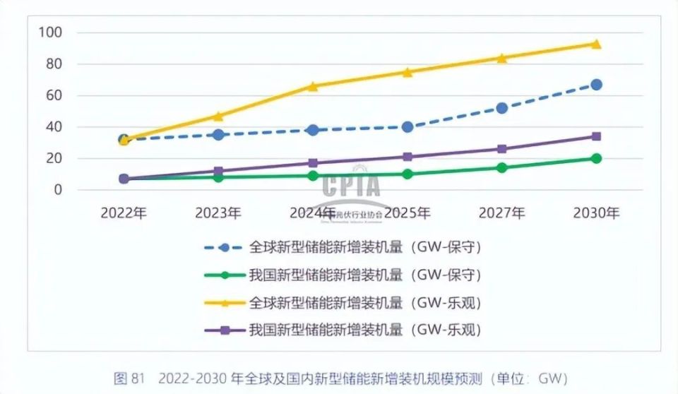 據(jù)中國光伏行業(yè)協(xié)會(CPIA)的統(tǒng)計(jì),2022年全球及國內(nèi)新型儲能新增裝機(jī)約為32GW、7GW,創(chuàng)歷史新高。隨著政策執(zhí)行、成本下降和技術(shù)改進(jìn),新型儲能將更能滿足發(fā)電側(cè)、電網(wǎng)側(cè)、用戶側(cè)的電力儲能需求。預(yù)計(jì)2025年,全球及我國新型儲能年度新增裝機(jī)或分別超過40GW、10GW,有望達(dá)到75GW、21GW。