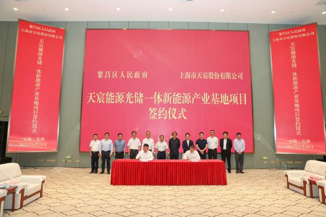 近日,總投資116億元的天宸能源光儲一體新能源產(chǎn)業(yè)基地項目正式簽約。省政府駐滬辦黨組成員、副主任賀東,天宸股份有限公司董事長葉茂菁、副董事長王學(xué)進(jìn),省生態(tài)環(huán)境廳副廳長羅宏,蕪湖市副市長向繼輝,市政府秘書長王志鵬,繁昌區(qū)委書記瞿輝,區(qū)長許有龍等見證項目簽約。