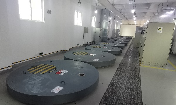 距離儲(chǔ)能電站不遠(yuǎn)的飛輪儲(chǔ)能項(xiàng)目,是國內(nèi)首個(gè)投入運(yùn)行的與百萬千瓦級(jí)中間二次再熱火電機(jī)組聯(lián)合調(diào)頻項(xiàng)目,也是國內(nèi)首個(gè)室內(nèi)飛輪儲(chǔ)能項(xiàng)目。記者在廠房看到,10個(gè)直徑2米左右的井蓋依次排列,打開地井就看到了外形類似豎立大桶的磁懸浮飛輪儲(chǔ)能裝置。