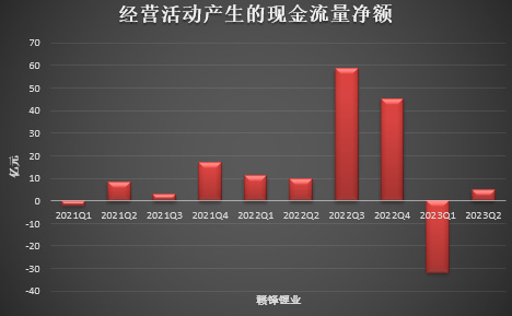 好在二季度,隨著鋰價在30萬元/噸企穩(wěn),中下游廠商在一季度過度去庫存以后,二季度的采購也有所回調,贛鋒鋰業(yè)的經營活動現金流因此也有所回暖,重新回歸正數達到4.78億元,但是相較去年同期的高景氣水平依舊有較大差距。