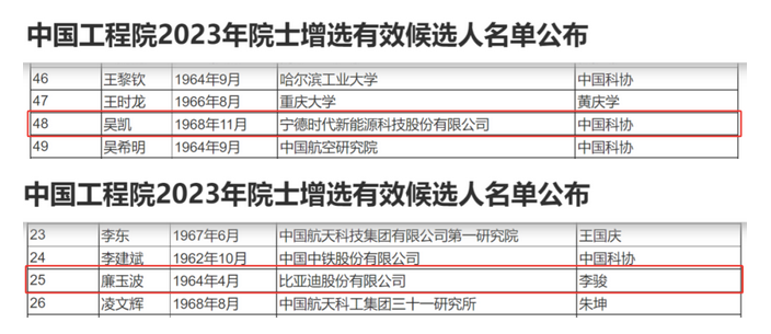 比亞迪、寧德時(shí)代首席科學(xué)家雙雙入圍中國(guó)工程院院士候選名單