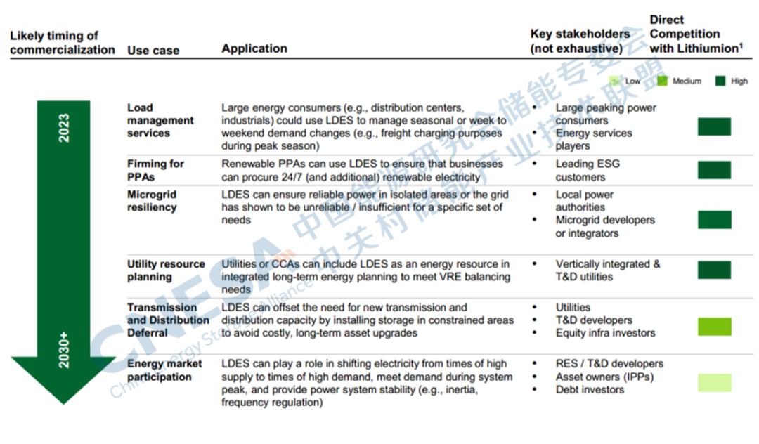 從應(yīng)用場(chǎng)景上講,LDES在用電負(fù)荷管理,電力購(gòu)買(mǎi)協(xié)議,微網(wǎng)韌性和電力資源規(guī)劃等應(yīng)用場(chǎng)景與鋰電有較強(qiáng)的競(jìng)爭(zhēng)關(guān)系,而在推遲輸配電網(wǎng)建設(shè)和參加電力市場(chǎng)方面的競(jìng)爭(zhēng)關(guān)系相對(duì)較弱。