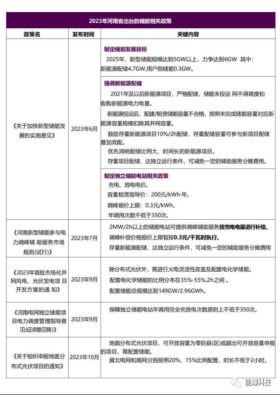 為推動河南儲能項目的開展,2023年,河南省密集出臺多項政策推動儲能發(fā)展,涉及電力調(diào)峰輔助服務(wù)、新能源配儲、獨(dú)立儲能容量租賃及調(diào)用次數(shù)等多方面。