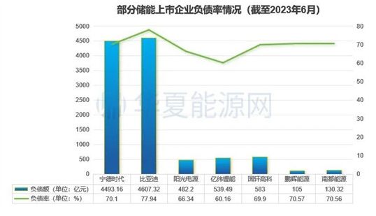 華夏能源網(wǎng)注意到,在不切實(shí)際的瘋狂擴(kuò)充下,高負(fù)債已成儲(chǔ)能行業(yè)常態(tài),行業(yè)龍頭也不例外。數(shù)據(jù)顯示,截至今年6月底,比亞迪(SZ:002594)、鵬輝能源、南都電源(SZ:300068)、寧德時(shí)代(SZ:300750)的負(fù)債率均超過了70%;國軒高科(SZ:002074)、陽光電源(SZ:300274)也超過60%。