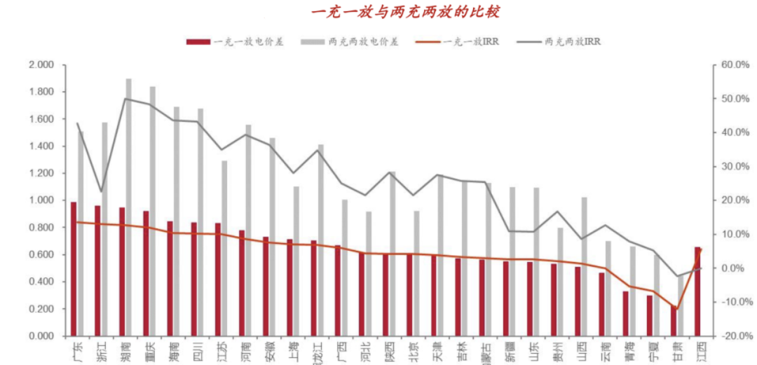 經(jīng)濟性分析:我們以容量1MWh、循環(huán)次數(shù)為6000次的儲能系統(tǒng),浙江的峰谷電價為例,假設(shè)年運行天數(shù)為300天,單位投資為1.58元/Wh,充放電深度為90%,充、放電效率均為92%,考慮業(yè)主完全自建模式,不考慮資金成本,2充2放下(實際充放電次數(shù)假設(shè)為1.5),計算得IRR為22%,投資回收期為4.5年,儲能LCOS為0.49元/kWh。1充1放下,計算得IRR為8.86%,投資回收期為13年,儲能LCOS為0.72元/kWh。