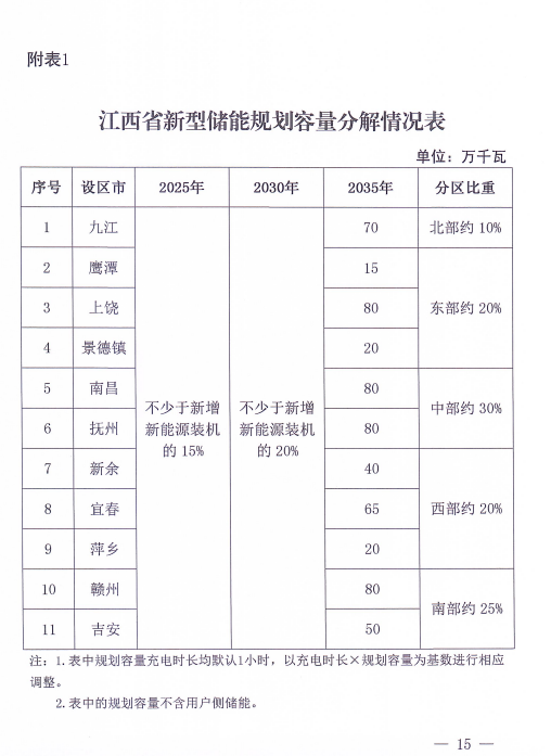 《發(fā)展規(guī)劃》制定了江西省分階段的儲能發(fā)展目標:到2025年、2030年,力爭實現(xiàn)各設區(qū)市新型儲能投產(chǎn)規(guī)模不少于新增新能源裝機的15%和20%。到2035年,力爭實現(xiàn)全省新型儲能投產(chǎn)600萬千瓦以上。