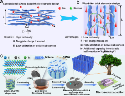 圖3.a) 具有密堆積結(jié)構(gòu)的傳統(tǒng)MXene厚電極設(shè)計(jì)與b)具有類木質(zhì)微結(jié)構(gòu)的MXene/AgNWs混合厚電極設(shè)計(jì)在結(jié)構(gòu)和功能上的優(yōu)勢(shì)比較;c) 類木MXene/AgNWs混合厚電極的制備過(guò)程和微型氧化還原電容器的組裝示意圖。