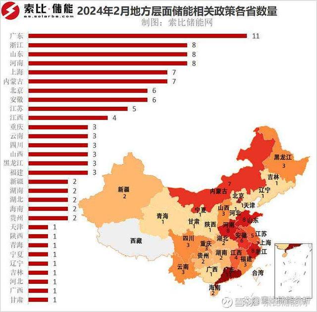 從地域出發(fā),2月地方層面出臺(tái)的儲(chǔ)能相關(guān)政策分布在30個(gè)省市地區(qū),其中廣東憑借11條儲(chǔ)能相關(guān)政策領(lǐng)跑全國(guó)。