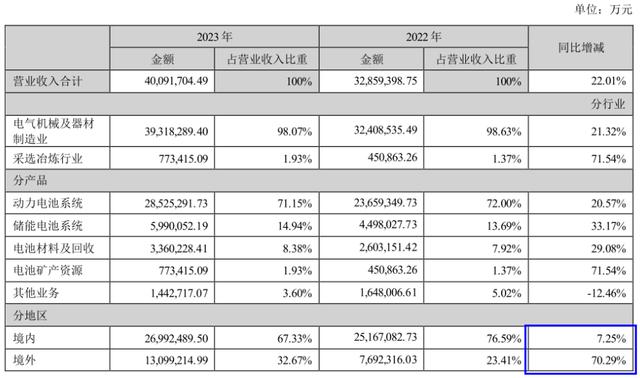從銷售區(qū)域來看,海外市場已經(jīng)成為推動寧德時代營收增長的關(guān)鍵。據(jù)公司年報數(shù)據(jù)顯示,2023年全年,寧德時代境外市場實現(xiàn)銷售收入1309.92億元,同比增長70.29%,收入占比為32.67%,同比提升了9.16個百分點(diǎn),毛利率為25.19%。對比看,公司境內(nèi)市場銷售收入為2699.25億元,同比增長7.25%,銷售毛利率為21.8%。