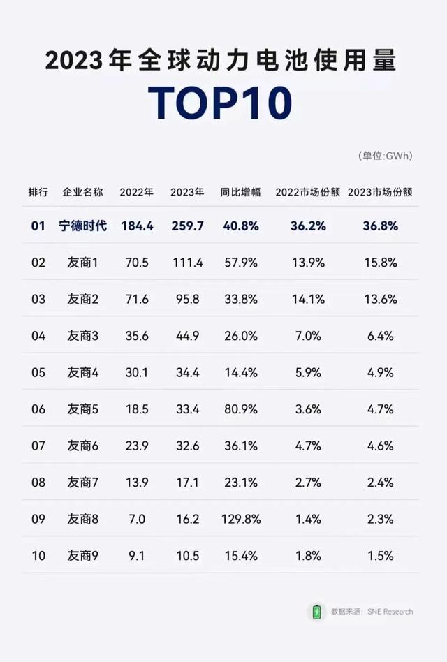 事實上,寧德時代評級之所以能夠獲得上調(diào),與其市場份額的持續(xù)提升不無關(guān)系?!?023年全球動力電池使用數(shù)據(jù)》顯示,2023年寧德時代動力電池使用量達(dá)259.7GWh,相較2022年增長40.8%,市場占有率高達(dá)36.8%,穩(wěn)居世界第一,比第二名高出近21個百分點(diǎn)。