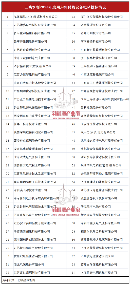不久前,三峽水利2024年度用戶側(cè)儲(chǔ)能設(shè)備框架協(xié)議采購,總共有64家企業(yè)投標(biāo)。