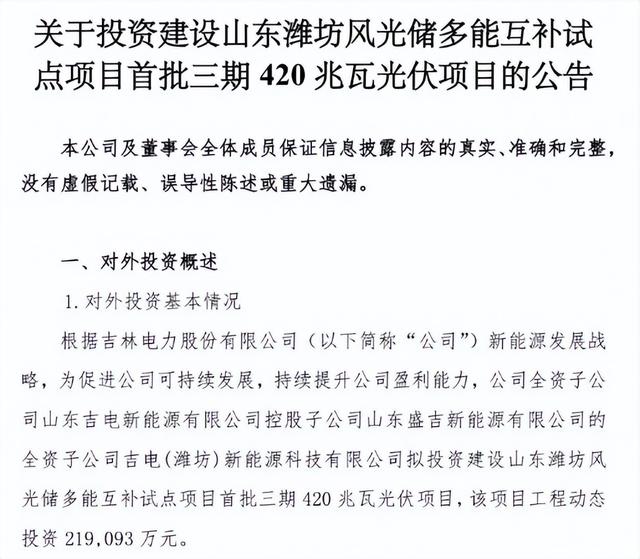 5月30日,吉電股份發(fā)布關于投資建設山東濰坊風光儲多能互補試點項目首批三期420兆瓦光伏項目的公告。