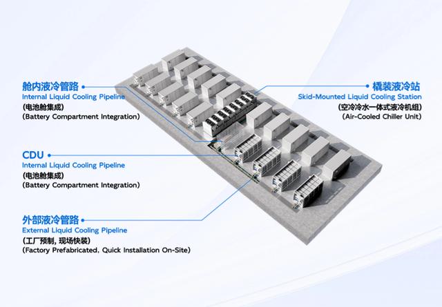 該系統(tǒng)由集中布置的液冷站、布置于電池艙內(nèi)的配水動力站(CDU) 、電池艙內(nèi)外液冷管路,以及TMS智控系統(tǒng)組成,其具有空冷冷水一體式液冷機組和均衡智控 TMS 兩項節(jié)能關(guān)鍵技術(shù):首先是集中式液冷機組相比分布式液冷機組全年能效比提高113%,全年節(jié)省能耗大于50%。其次是均衡智控TMS基于負荷實時預測、CPC均衡模型等,可精準預測電池系統(tǒng)溫控目標曲線,實現(xiàn)電芯均衡冷卻,可使液冷系統(tǒng)冷卻能力輸出峰值降低35%以上,帶來液冷站配置規(guī)模可減小35%或節(jié)能45%,相比于分布式電池艙液冷系統(tǒng)節(jié)能效果顯著,在儲能液冷、數(shù)據(jù)中心液冷等領(lǐng)域都具備良好的應用前景。