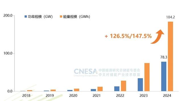 據(jù)CNESA DataLink全球儲(chǔ)能數(shù)據(jù)庫(kù)統(tǒng)計(jì),截至2024年底,我國(guó)電力儲(chǔ)能累計(jì)裝機(jī)量實(shí)現(xiàn)重大突破,首次突破百吉瓦大關(guān),達(dá)到137.9GW。其中,新型儲(chǔ)能裝機(jī)規(guī)模首次超過(guò)抽水蓄能,達(dá)到78.3GW/184.2GWh,功率和能量規(guī)模同比增長(zhǎng)分別達(dá)到126.5%和147.5%。這一數(shù)據(jù)標(biāo)志著中國(guó)新型儲(chǔ)能產(chǎn)業(yè)發(fā)展進(jìn)入新的歷史階段。