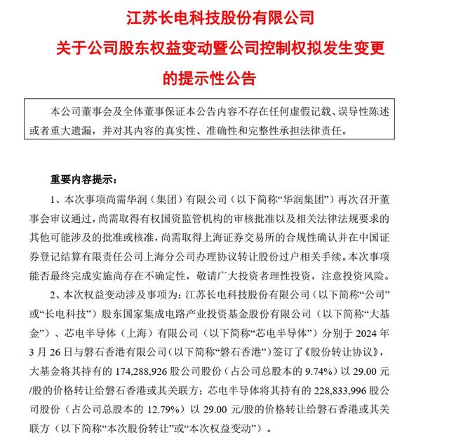 3月26日晚間,長電科技(SH600584,股價(jià)28.25元,市值505.3億元)發(fā)布公告稱,公司股東國家集成電路產(chǎn)業(yè)投資基金股份有限公司(以下簡稱“大基金”)、芯電半導(dǎo)體(上海)有限公司(以下簡稱“芯電半導(dǎo)體”)分別與磐石香港有限公司(以下簡稱“磐石香港”)簽訂《股份轉(zhuǎn)讓協(xié)議》,大基金及芯電半導(dǎo)體均以29元/股價(jià)格將合計(jì)所持22.53%公司股份轉(zhuǎn)讓給磐石香港或其關(guān)聯(lián)方;完成后公司控股股東將變更為磐石香港或其關(guān)聯(lián)方,實(shí)控人將變更為中國華潤,公司股票復(fù)牌。