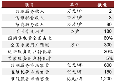 參考電力云平臺(tái)運(yùn)營(yíng)商新聯(lián)電子的電力監(jiān)測(cè)服務(wù)數(shù)據(jù),為專變用戶提供的電力監(jiān)測(cè)及運(yùn)維托管服務(wù)均以年度收費(fèi) 2 萬(wàn)/戶及 3 萬(wàn)/戶計(jì)算,若為全國(guó)約 300 戶專變用戶均提供電力監(jiān)測(cè)服務(wù),同時(shí)假設(shè)對(duì)運(yùn)維托管服務(wù)付費(fèi)的用戶約占總體的 20%,將實(shí)現(xiàn)分別為約 600 億、180 億的年度市場(chǎng)。