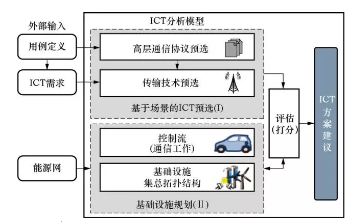 對ICT的研究是個較為前沿的課題。文獻[10]提出了一種應(yīng)用于智能配電網(wǎng)規(guī)劃的ICT模型,如圖3所示。此模型主要分為兩部分:基于場景的預(yù)選和基礎(chǔ)設(shè)施規(guī)劃。首先,不考慮網(wǎng)絡(luò)和基礎(chǔ)設(shè)施的具體情況進行預(yù)選,生成ICT技術(shù)方案通用集合和高層協(xié)議;其次,針對具體的能源網(wǎng)進行基礎(chǔ)設(shè)施規(guī)劃,確定若干ICT技術(shù)方案;這兩部分均依賴于由規(guī)劃人員提供的外部數(shù)據(jù),例如所定義的用例和對ICT的各種需求。最后,對兩部分的輸出進行成本效益分析,針對給定的外部數(shù)據(jù)確定合適的ICT技術(shù)方案。正如文獻[10]所指出的,對ICT進行合理規(guī)劃可以避免使用擴建電網(wǎng)的傳統(tǒng)手段,延緩電網(wǎng)的一次投資。
