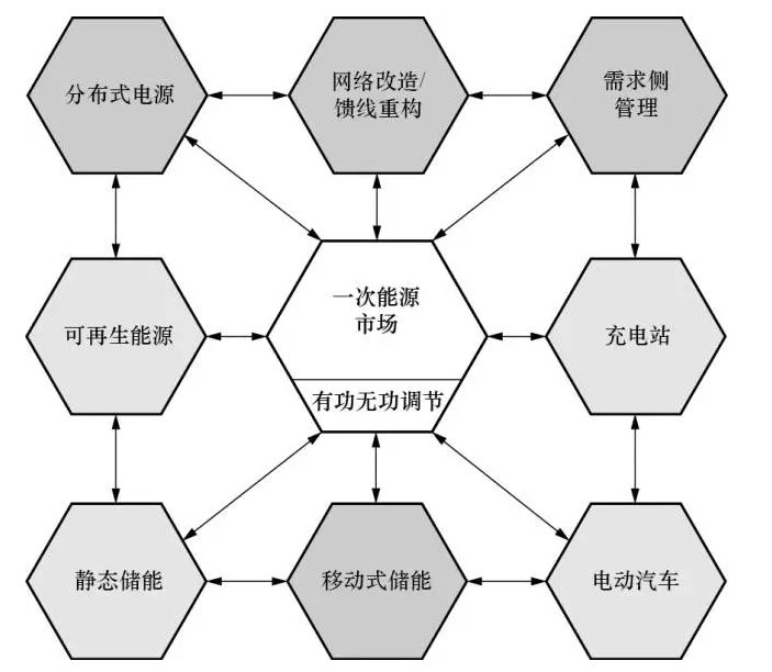為了輔助智能電網(wǎng)規(guī)劃人員確保系統(tǒng)運行的安全性,可靠性以及供電質(zhì)量,需要開發(fā)綜合全面的新工具。文獻[16]通過對智能技術(shù)及其交互方式進行分類,設(shè)計了一個專為智能電網(wǎng)規(guī)劃人員量身定做的工具箱架構(gòu)(如圖5所示)。規(guī)劃人員在確定電網(wǎng)建設(shè)和饋線重構(gòu)方案時,并非像傳統(tǒng)做法那樣只考慮峰荷,而是同時考慮分布式電源(DG)、移動式存儲和需求側(cè)管理(DSM),這樣得到的方案更具成本效益。通過可再生能源和靜態(tài)儲能相互配合可以削峰填谷,增加網(wǎng)絡(luò)容量;充電站的電動汽車耗電量受實時電價變化的影響,因此可作為DSM的一部分;各類儲能設(shè)備可被用來提升電能質(zhì)量,因此可被視為有功/無功功率源;一次能源市場運行人員在擁有發(fā)電和儲能資源的輸配電運行人員之間進行協(xié)調(diào)優(yōu)化,得到實時電價,通過AMI提供給用戶。此工具箱的理念和結(jié)構(gòu)尚未成熟,還需在未來的研究工作中進一步完善。