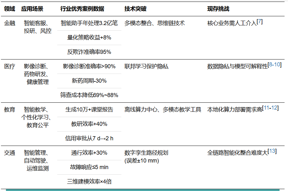 當(dāng)前,AI大模型已在金融、醫(yī)療、教育、交通等領(lǐng)域?qū)崿F(xiàn)深度滲透,展現(xiàn)出顯著的產(chǎn)業(yè)價值與技術(shù)潛力。如表1所示,在金融領(lǐng)域,智能客服與風(fēng)控系統(tǒng)的高效運(yùn)作體現(xiàn)了多模態(tài)整合與思維鏈技術(shù)的成熟應(yīng)用,但核心決策仍依賴人工。醫(yī)療領(lǐng)域通過聯(lián)邦學(xué)習(xí)等技術(shù)突破,在影像診斷、藥物研發(fā)等方面取得成果,但數(shù)據(jù)隱私與模型可解釋性仍是關(guān)鍵瓶頸。教育領(lǐng)域依托離線算力中心與多模態(tài)工具,實(shí)現(xiàn)教學(xué)效率躍升,而本地化算力需求成為規(guī)?;瘧?yīng)用的制約因素。交通領(lǐng)域借助數(shù)字孿生技術(shù)顯著提升運(yùn)維效率,但全鏈路智能化整合仍需突破。