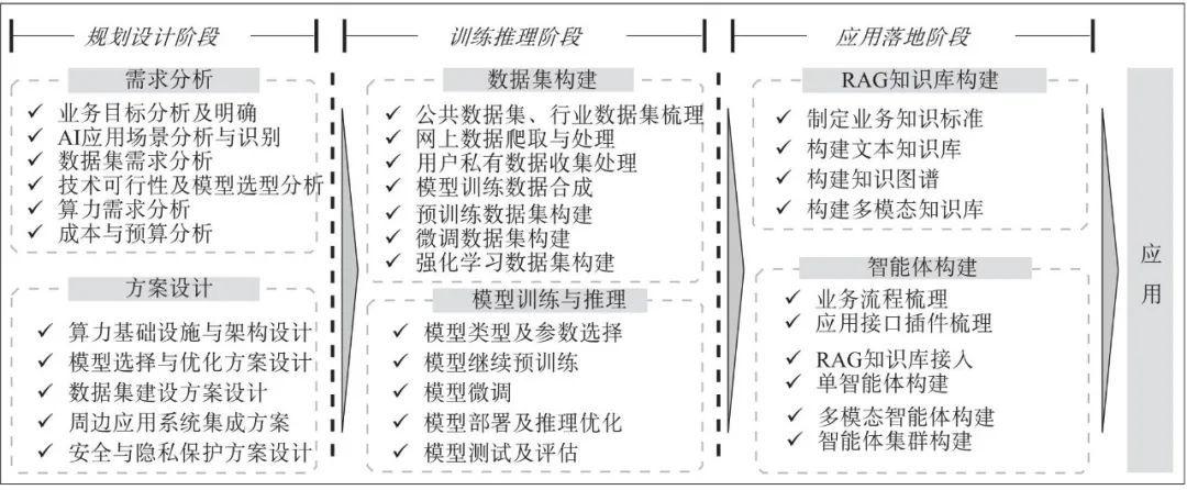 AI工程化整體流程涵蓋規(guī)劃設(shè)計(jì)、訓(xùn)練推理和應(yīng)用落地三個階段(如圖1所示)。在規(guī)劃設(shè)計(jì)階段,首要關(guān)注企業(yè)戰(zhàn)略和業(yè)務(wù)目標(biāo)選擇,圍繞全鏈路規(guī)劃展開需求分析,包括業(yè)務(wù)目標(biāo)分析、AI應(yīng)用場景分析、數(shù)據(jù)需求分析、技術(shù)可行性及算力需求分析等。同時,基于AI原生(AI Native)的系統(tǒng)方案設(shè)計(jì)強(qiáng)調(diào)業(yè)務(wù)需求理解、數(shù)據(jù)治理、模型優(yōu)化與部署以及監(jiān)控與運(yùn)維的重要性,遵循以AI為核心、數(shù)據(jù)優(yōu)先、持續(xù)學(xué)習(xí)與迭代、自適應(yīng)與個性化等設(shè)計(jì)原則。在訓(xùn)練推理階段,針對通用AI大模型存在的“有幻覺、成本高”等問題,行業(yè)、領(lǐng)域AI大模型成為落地“人工智能+”的有效手段,企業(yè)需根據(jù)自身情況選擇開發(fā)L1行業(yè)模型或L2場景模型,并依托成熟工具平臺支撐數(shù)據(jù)集工程交付能力,同時注重模型體系設(shè)計(jì)與選擇、訓(xùn)練及調(diào)優(yōu)以及推理優(yōu)化及評估等關(guān)鍵環(huán)節(jié)。在應(yīng)用落地階段,智能體應(yīng)用為AI大模型應(yīng)用落地提供技術(shù)化手段,通過構(gòu)建檢索增強(qiáng)生成(Retrieval-Augmented Generation,RAG)知識庫解決私域數(shù)據(jù)利用及實(shí)時性問題,同時智能體構(gòu)建的技術(shù)方法手段多樣,包括通過開發(fā)框架直接開發(fā)和基于智能體使能平臺構(gòu)建應(yīng)用,且智能體全生命周期可觀測體系和集群全生命周期管理體系為企業(yè)AI應(yīng)用的穩(wěn)定運(yùn)行和持續(xù)優(yōu)化提供保障。