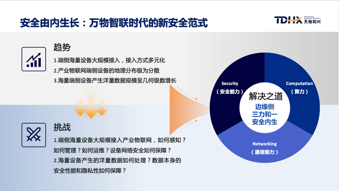 工業(yè)和信息化部研究機(jī)構(gòu)數(shù)據(jù)顯示:我國工業(yè)互聯(lián)網(wǎng)產(chǎn)業(yè)規(guī)模目前已邁過了“萬億”大關(guān),并進(jìn)一步刺激了數(shù)字經(jīng)濟(jì)在工業(yè)領(lǐng)域的廣泛應(yīng)用,工業(yè)制造的數(shù)字化和網(wǎng)絡(luò)化催生出巨大的網(wǎng)絡(luò)安全需求。天地和興CTO李凱斌介紹:數(shù)字經(jīng)濟(jì)大背景下,萬物智聯(lián)時(shí)代將面臨新安全挑戰(zhàn),即:1、端側(cè)海量設(shè)備大規(guī)模接入產(chǎn)業(yè)物聯(lián)網(wǎng),如何感知?如何管理?如何運(yùn)維?設(shè)備網(wǎng)絡(luò)安全如何保障?2、海量設(shè)備產(chǎn)生的洋量數(shù)據(jù)如何處理?數(shù)據(jù)本身的安全性能和隱私性如何保障?而解決之道在于“三力合一”:安全能力、算力、通信能力,三者合一。安全,由內(nèi)生長。
