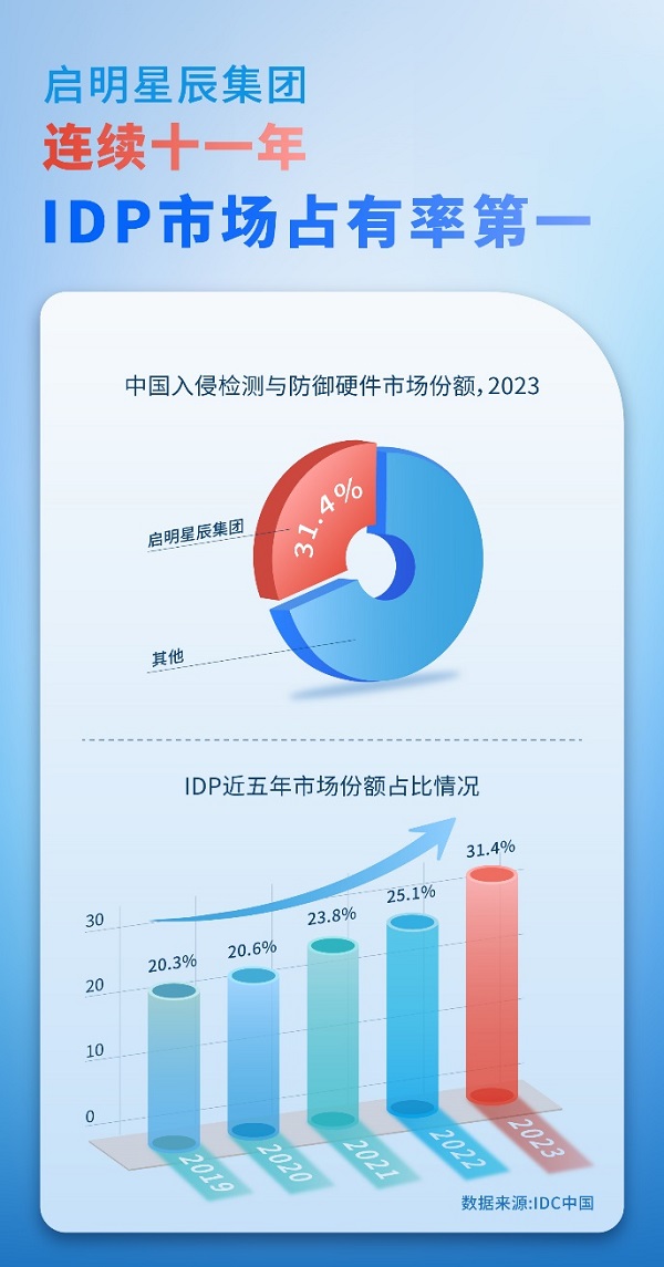 本網(wǎng)訊 近日,IDC發(fā)布《2023年第四季度中國(guó)IT安全硬件市場(chǎng)跟蹤報(bào)告》。報(bào)告顯示,2023年啟明星辰集團(tuán)入侵檢測(cè)與防御(IDP)以31.4%的市場(chǎng)份額再次蟬聯(lián)國(guó)內(nèi)市場(chǎng)第一。至此,啟明星辰集團(tuán)已連續(xù)十一年領(lǐng)跑IDP市場(chǎng),且連續(xù)多年份額占比持續(xù)攀升!