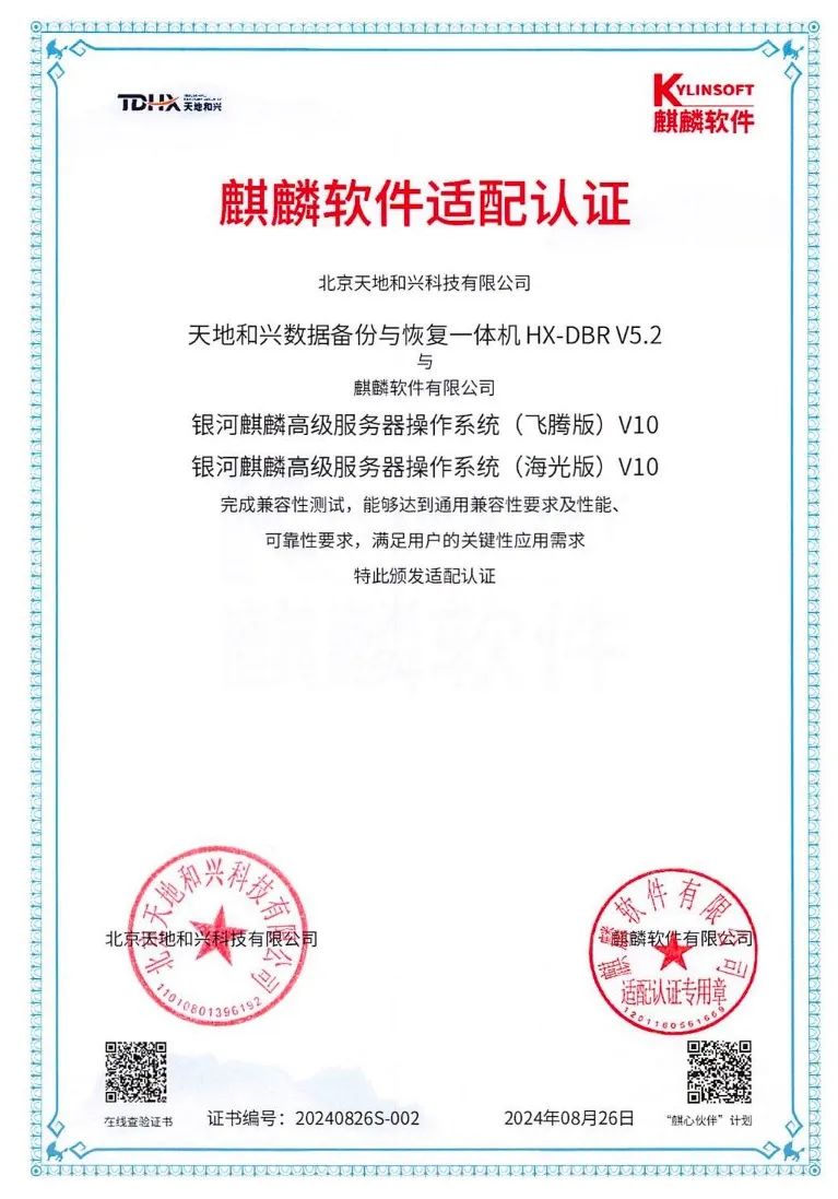 經(jīng)過嚴(yán)格測試與深度合作,天地和興與麒麟軟件順利完成了產(chǎn)品兼容性認(rèn)證。測試結(jié)果表明,天地和興的數(shù)據(jù)備份與恢復(fù)一體機(jī)在麒麟軟件銀河麒麟高級服務(wù)器操作系統(tǒng)V10上運(yùn)行穩(wěn)定,表現(xiàn)出色,充分滿足了用戶在性能和可靠性方面的需求。