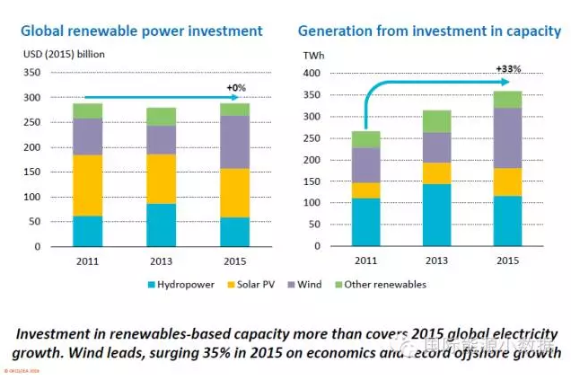 特別值得一提的是,2011年以來全球在可再生能源發(fā)電投資基本平穩(wěn),但是由于可再生能源成本的下降,每年新增的可再生能源發(fā)電量逐年增加,2015年超出2011年33%。此外,電力儲(chǔ)能投資2015年超過100億美元,是2010年的10倍;但是儲(chǔ)能投資僅占電網(wǎng)投資的0.4%,還有很長(zhǎng)的路要走。
