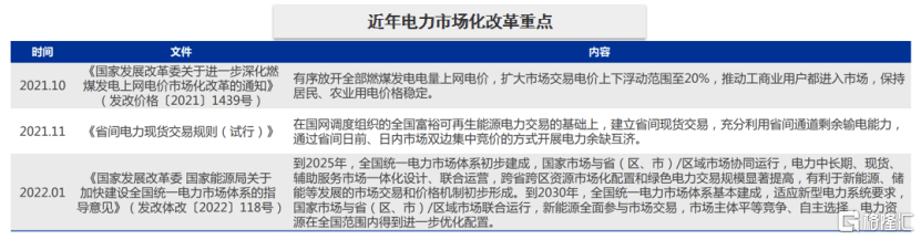 2019年9月,我國將煤電上網(wǎng)電價(jià)機(jī)制由標(biāo)桿電價(jià)改為“基準(zhǔn)浮動”機(jī)制。2021年10月8日,國常會即提出改革完善煤電價(jià)格市場化形成機(jī)制,提出燃煤發(fā)電量原則上全部進(jìn)入市場,浮動范圍擴(kuò)大至正負(fù)20%,高耗能行業(yè)電價(jià)不受限制。