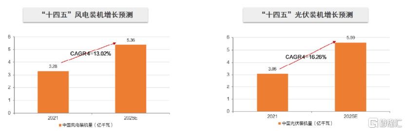 一方面,在“雙碳”目標(biāo)下,新能源裝機(jī)量有望持續(xù)增長,尤其是風(fēng)電、光伏領(lǐng)域。根據(jù)全球能源互聯(lián)網(wǎng)發(fā)展合作組織預(yù)測,到2025年,我國清潔能源裝機(jī)量將達(dá)到17億千瓦,其中風(fēng)電裝機(jī)容量將達(dá)到5.36億千瓦,2021-2025年CAGR達(dá)13%;光伏裝機(jī)容量將達(dá)到5.59億千瓦,2021-2025年CAGR達(dá)16.26%。