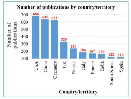 在理論研究方面,卡塔爾大學(xué)工程學(xué)院學(xué)者Ahmad K. Sleiti在2022年通過研究發(fā)現(xiàn),數(shù)字孿生技術(shù)在能源行業(yè)中的研究成果依舊集中在經(jīng)濟(jì)發(fā)達(dá)地區(qū),其中歐盟地區(qū)發(fā)表成果最多。據(jù)下列圖表顯示,歐盟地區(qū)(德國、意大利、法國、西班牙)研究成果整體數(shù)量高于美國、中國、英國以及俄羅斯國家等國家,占據(jù)全球第一位。