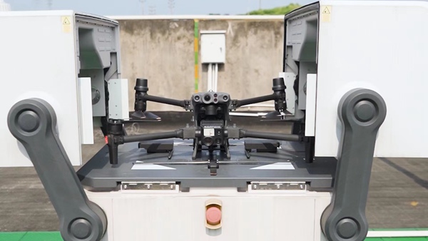 無人機(jī)從機(jī)巢飛出自主巡檢。國(guó)網(wǎng)重慶市電力公司供圖