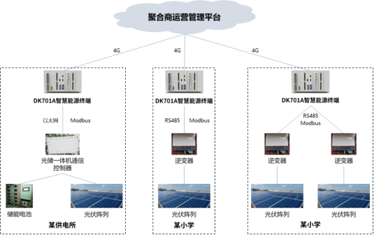 基于DK701智能終端平臺的優(yōu)勢特性,目前江行智能已成功開發(fā)DK701A智慧能源終端和DK701E儲能EMS就地控制器,并應(yīng)用到虛擬電廠聚合商運營管理系統(tǒng)及數(shù)字配電網(wǎng)臺區(qū)儲能等項目建設(shè),在光伏、儲能、充電樁等具體場景發(fā)揮了重要作用。以國網(wǎng)寧夏某公司打造的聚合商運營管理系統(tǒng)為例,通過在供電所、小學(xué)配置智慧能源終端,可將自身所擁有的分布式光伏、分布式儲能、電采暖等可調(diào)節(jié)資源數(shù)據(jù)接入省級虛擬電廠運營管理平臺,實現(xiàn)對可調(diào)節(jié)資源的可觀、可測、可調(diào)、可控。