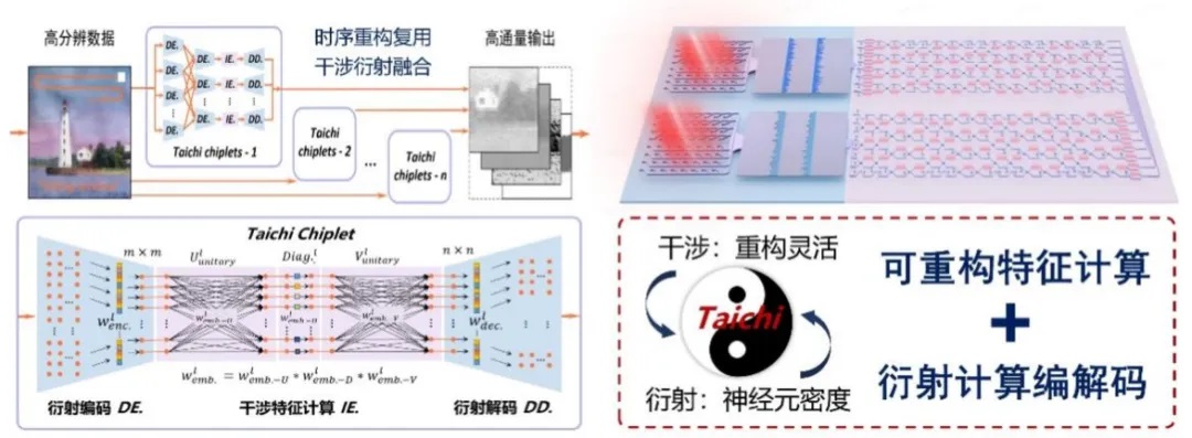 清華大學(xué)電子工程系副教授方璐課題組、自動化系戴瓊海院士課題組,首創(chuàng)分布式廣度光計算架構(gòu),研制大規(guī)模干涉-衍射異構(gòu)集成芯片太極,實現(xiàn)160 TOPS/W的通用智能計算。