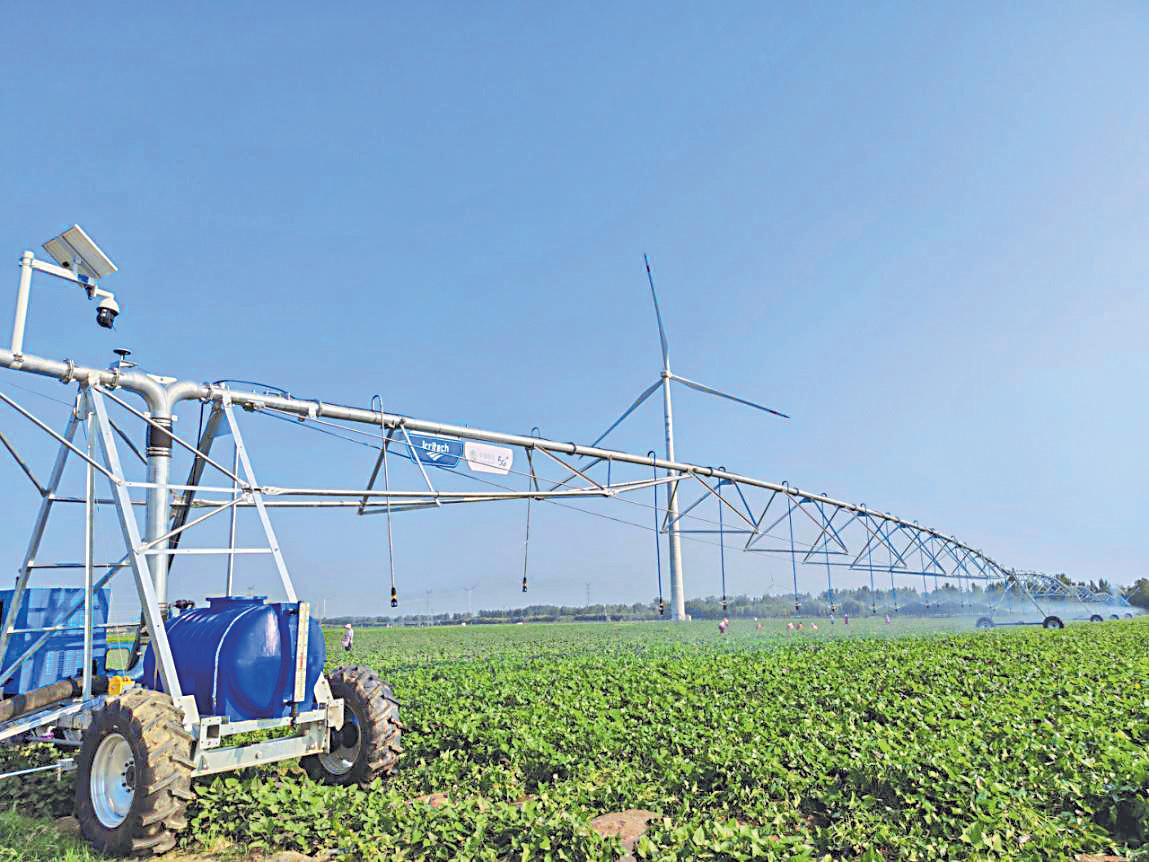 在延津縣,萬畝高標(biāo)準(zhǔn)農(nóng)田里的夏玉米已進(jìn)入灌漿期,該階段澆水增肥是增加產(chǎn)量、保障豐產(chǎn)豐收的關(guān)鍵。在塔鋪街道大柳樹村的高標(biāo)準(zhǔn)農(nóng)田里,幾十米寬的大型平移式噴灌機(jī)似巨鳥展翅,在田間緩緩移動,“羽翼”下的幾十個噴頭噴出均勻的“水霧墻”,滋潤著莊稼,讓玉米“吃飽喝足”。中國移動5G水肥一體化智能灌溉技術(shù)將灌溉和施肥兩個農(nóng)業(yè)生產(chǎn)過程融合在一起,不僅實現(xiàn)了澆地向澆苗轉(zhuǎn)變,還能將水連同肥料直接輸送到玉米地里,讓玉米“渴”了就“喝”、“餓”了就“吃”,實現(xiàn)了對農(nóng)田水分和養(yǎng)分的綜合管理。