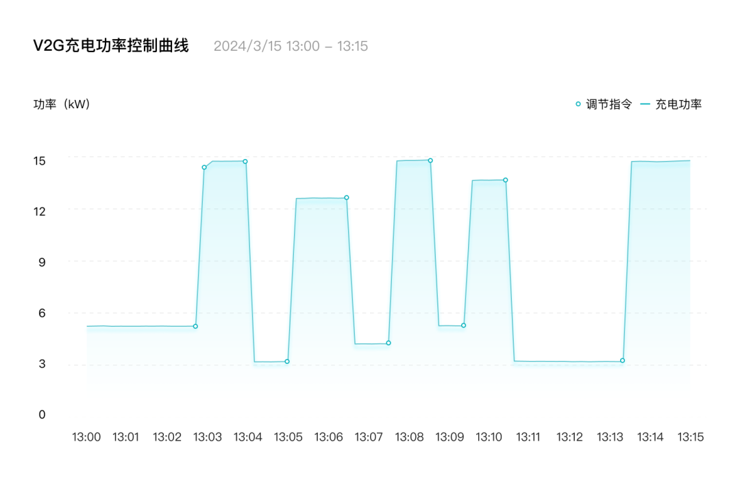 本次試驗(yàn)設(shè)備采用廣汽能源20kW一體式V2G充電樁及昊鉑HT車型,試驗(yàn)中,廣汽能源智慧管理云平臺模擬接收電網(wǎng)調(diào)控中心(虛擬電廠)的調(diào)頻指令,然后通過ADR技術(shù)連續(xù)15分鐘自動控制V2G充電及放電功率,秒級響應(yīng)虛擬電廠的調(diào)頻需求。