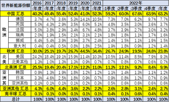 2021年全年的歐洲新能源市場(chǎng)受疫情影響,新能源增長(zhǎng)較弱。2022年仍受到疫情影響,歐洲2022年較2021年份額下降較大。近期中國(guó)新能源乘用車的增速?gòu)?qiáng)于世界平均增長(zhǎng)速度,2020年中國(guó)新能源乘用車世界份額較大反轉(zhuǎn)。2021年中國(guó)全年保持52%,較強(qiáng)。2022年1-12月的中國(guó)占世界新能源份額達(dá)到63.2%,其中10-12月的中國(guó)占世界份額63.9%。