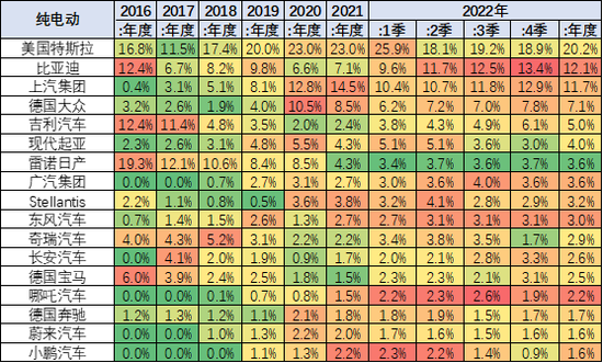 從歷年銷量份額看,特斯拉保持世界第一,目前持續(xù)走強(qiáng)。中國(guó)的比亞迪(294.540, -8.08, -2.67%)和上汽集團(tuán)(14.820, -0.14, -0.94%)的新能源表現(xiàn)優(yōu)秀,上汽乘用車和上汽五菱兩家自主車企表現(xiàn)很好。德國(guó)大眾的新能源車表現(xiàn)較強(qiáng),2021年受到疫情嚴(yán)重影響,加之去年年末沖刺,年初走勢(shì)偏弱。寶馬集團(tuán)、德國(guó)奔馳等保持在第二梯隊(duì)水平。