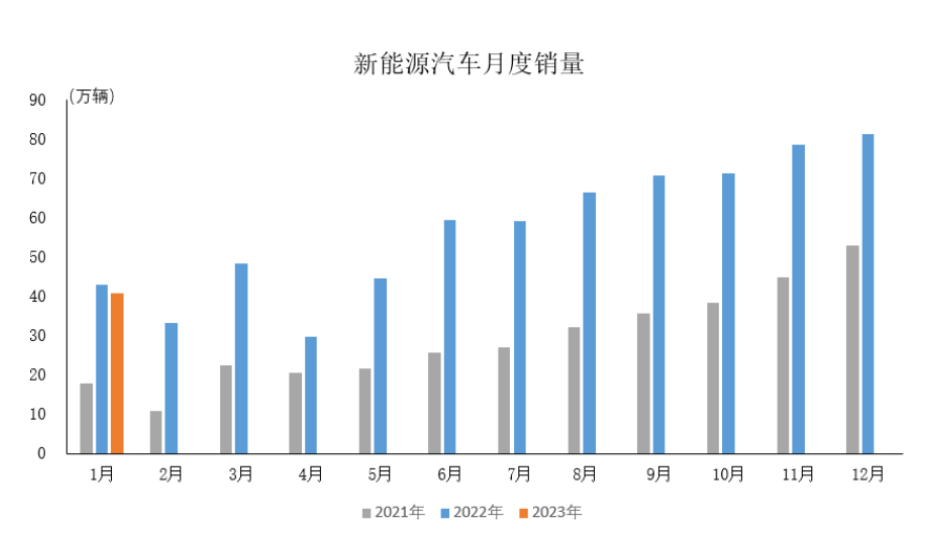2023年1月,新能源汽車產(chǎn)銷分別完成42.5萬(wàn)輛和40.8萬(wàn)輛,環(huán)比分別下降46.6%和49.9%,同比分別下降6.9%和6.3%,市場(chǎng)占有率達(dá)到24.7%。與2022年春節(jié)月(2月份)相比,產(chǎn)銷分別增長(zhǎng)15.4%和22.2%。