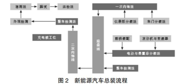 汽車總裝的含義是按照有關(guān)標(biāo)準(zhǔn),將汽車的各個零部件進(jìn)行合理的組裝和調(diào)配并最終形成完整汽車產(chǎn)品的過程。目前新能源汽車主要以純電動汽車為主,因此,本文的新能源汽車主要指純電動汽車。傳統(tǒng)汽車的總裝工藝主要包括裝配、檢測、路試、入庫、返修等環(huán)節(jié)。